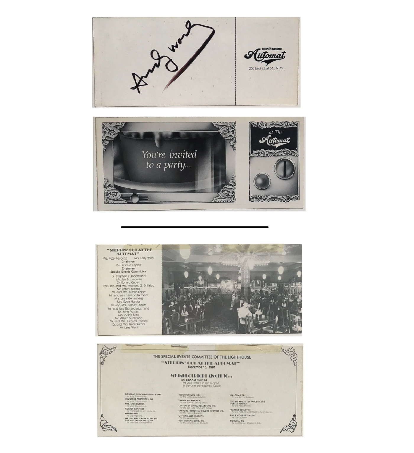 (blk. Sharpie), Fundraiser Lighthouse for the Blind 1981, Horn & Hart Automat Restaurant NYC. Great Signature Type, 4 x 8.5 in. (10.2 × 21.6 cm).