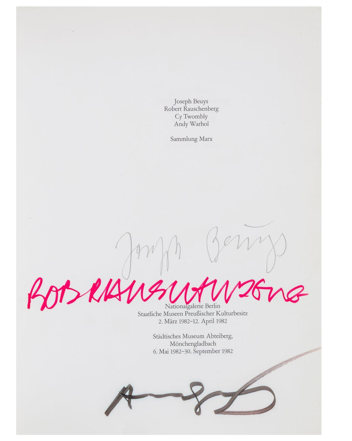 Front title with the handwritten signatures of the three icons of 20th century art: "Joseph Beuys" in pencil, "Bob Rauschenberg" in red and "Andy Warhol" in black felt pen. - All three were present at the opening of the exhibition and the press conference in the National Galerie Berlin in March 1982.