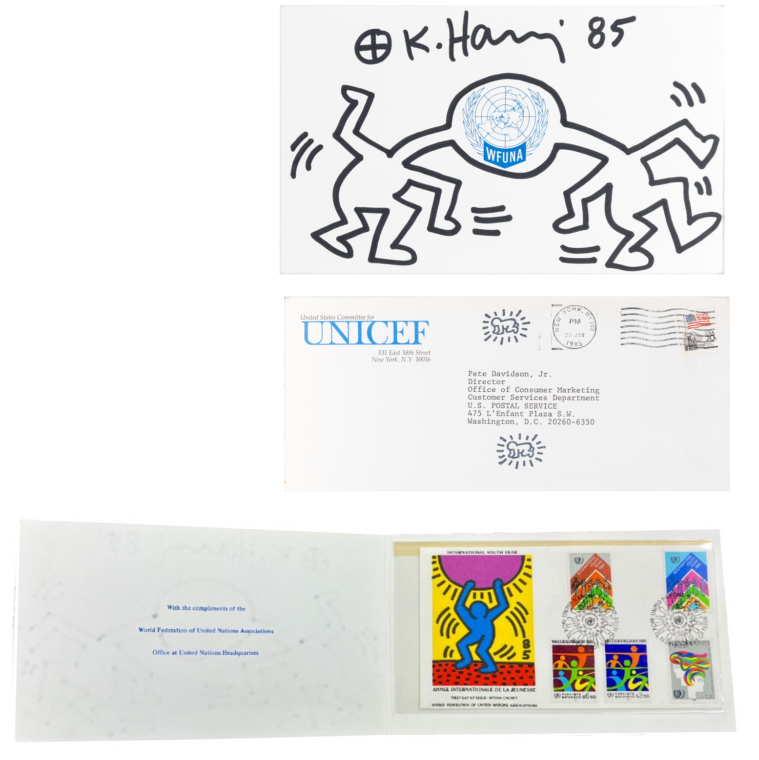 Drawing/Signed/Dated on United Nations foldout WFUNA card with attached stamped/postmarked envelope,